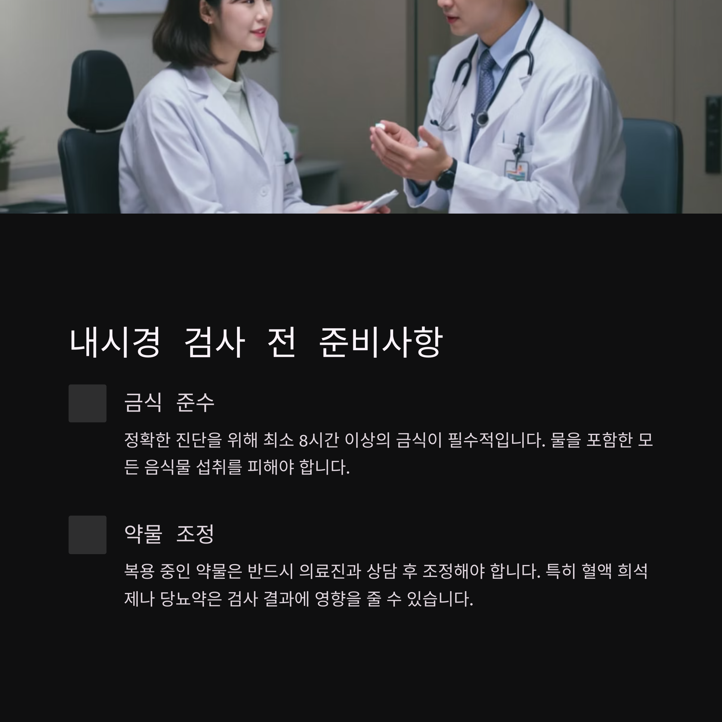 | 검사 전 금식 | 최소 8시간 금식은 필수입니다. |