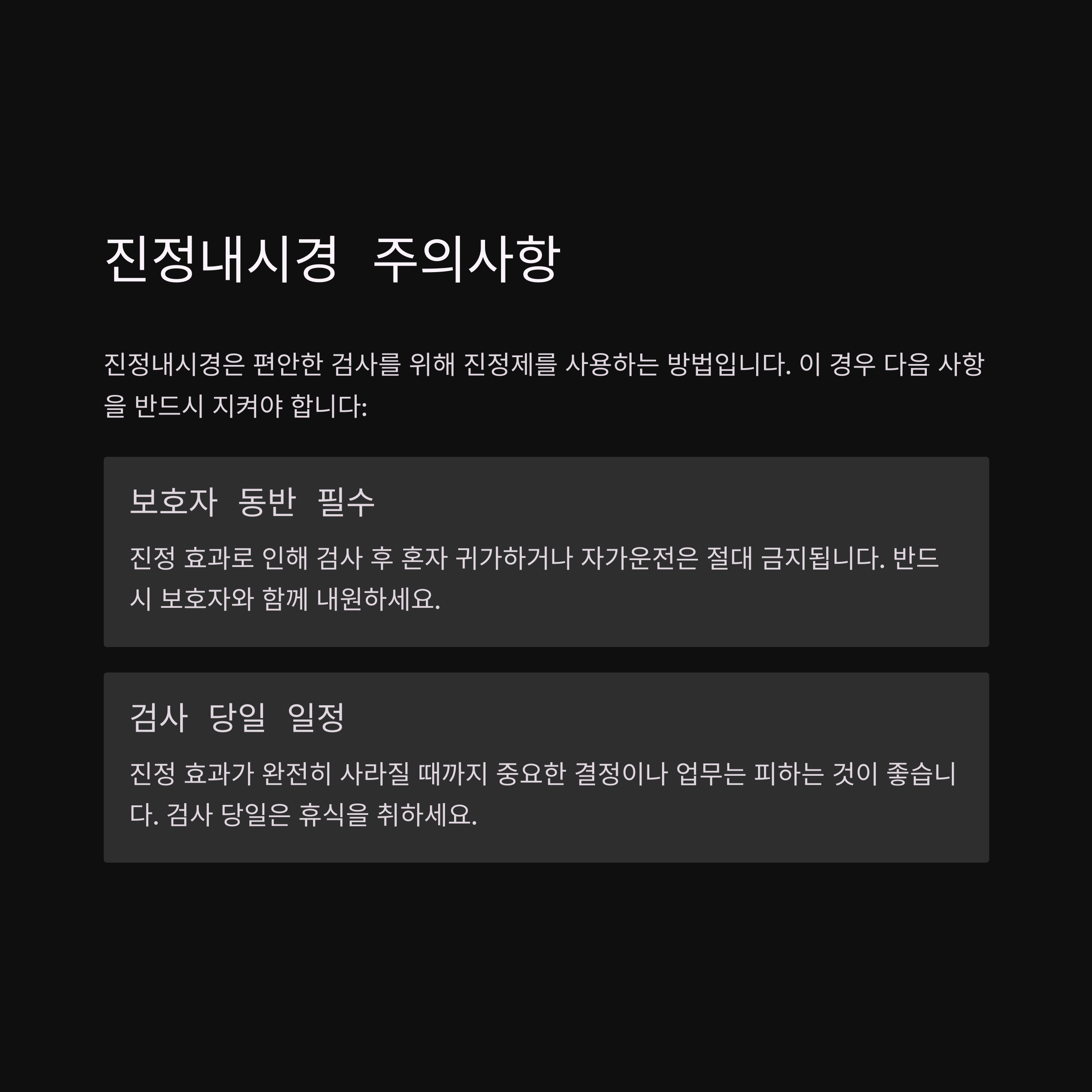 | 최소 8시간 이상 금식이 필요합니다. | 담당 의사와 약물 복용 여부 상담 필수 | 검사 후 자가운전 및 단독 귀가 금지 |