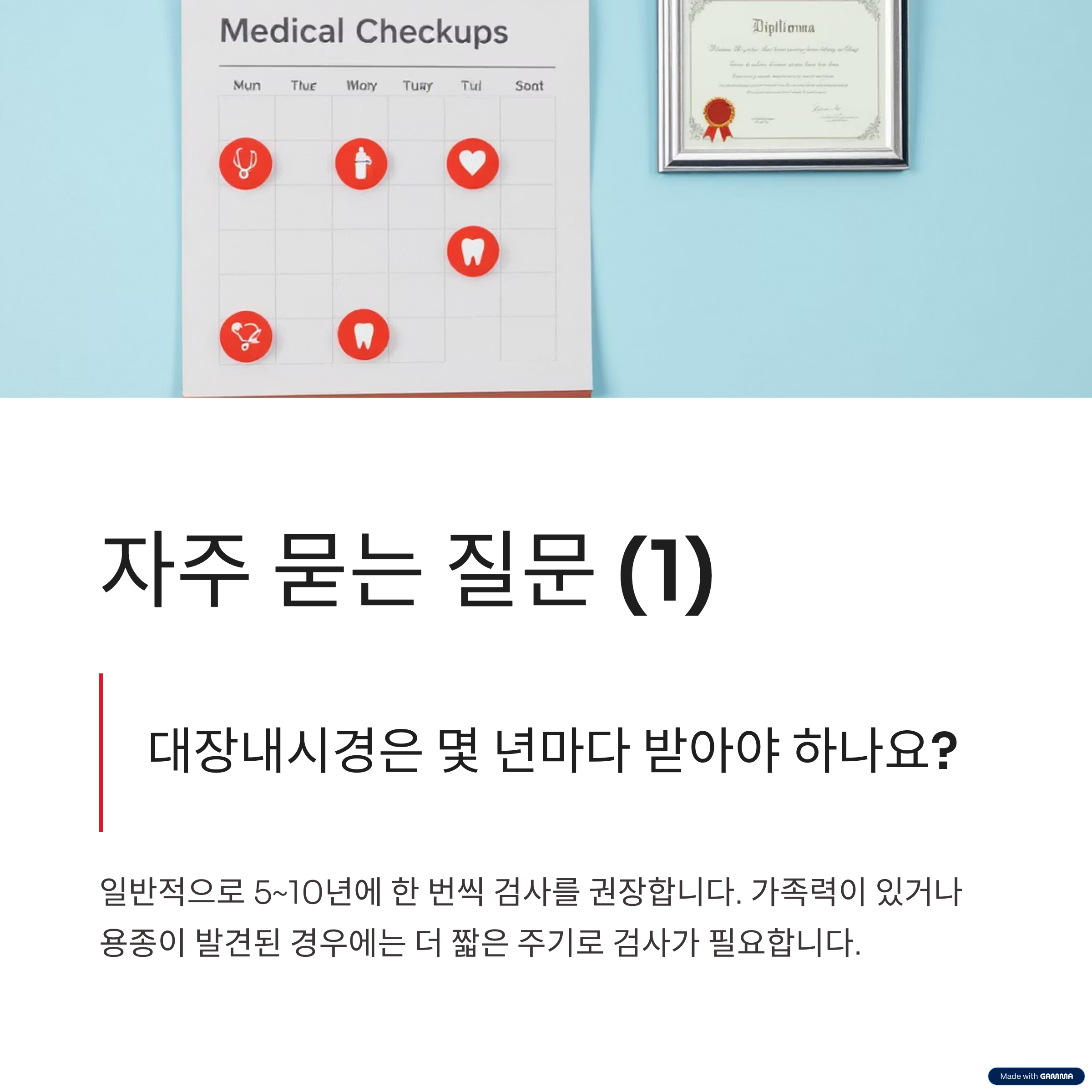 | 가족력이 있다면 더 자주 검진해야 합니다. | 용종은 암으로 발전 가능성이 있어 제거가 중요합니다. | 병원 방문 전 검사 비용 및 조건을 확인하세요. |
