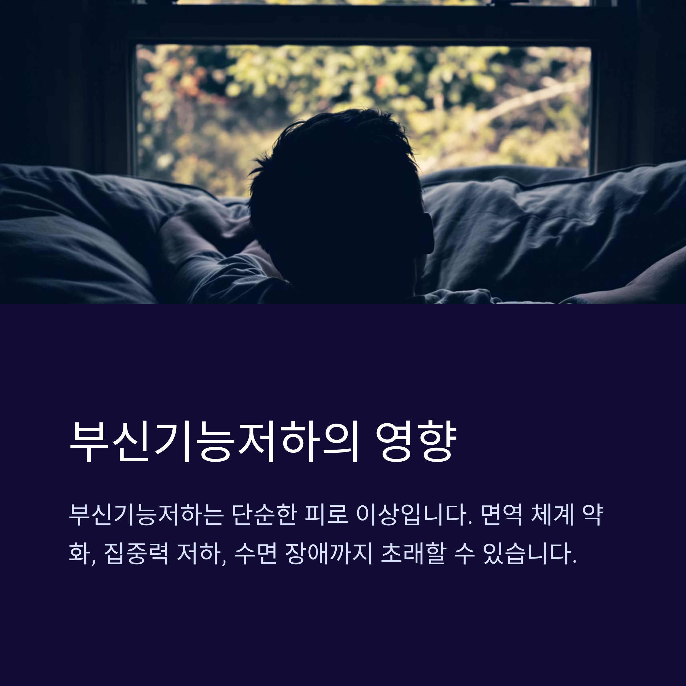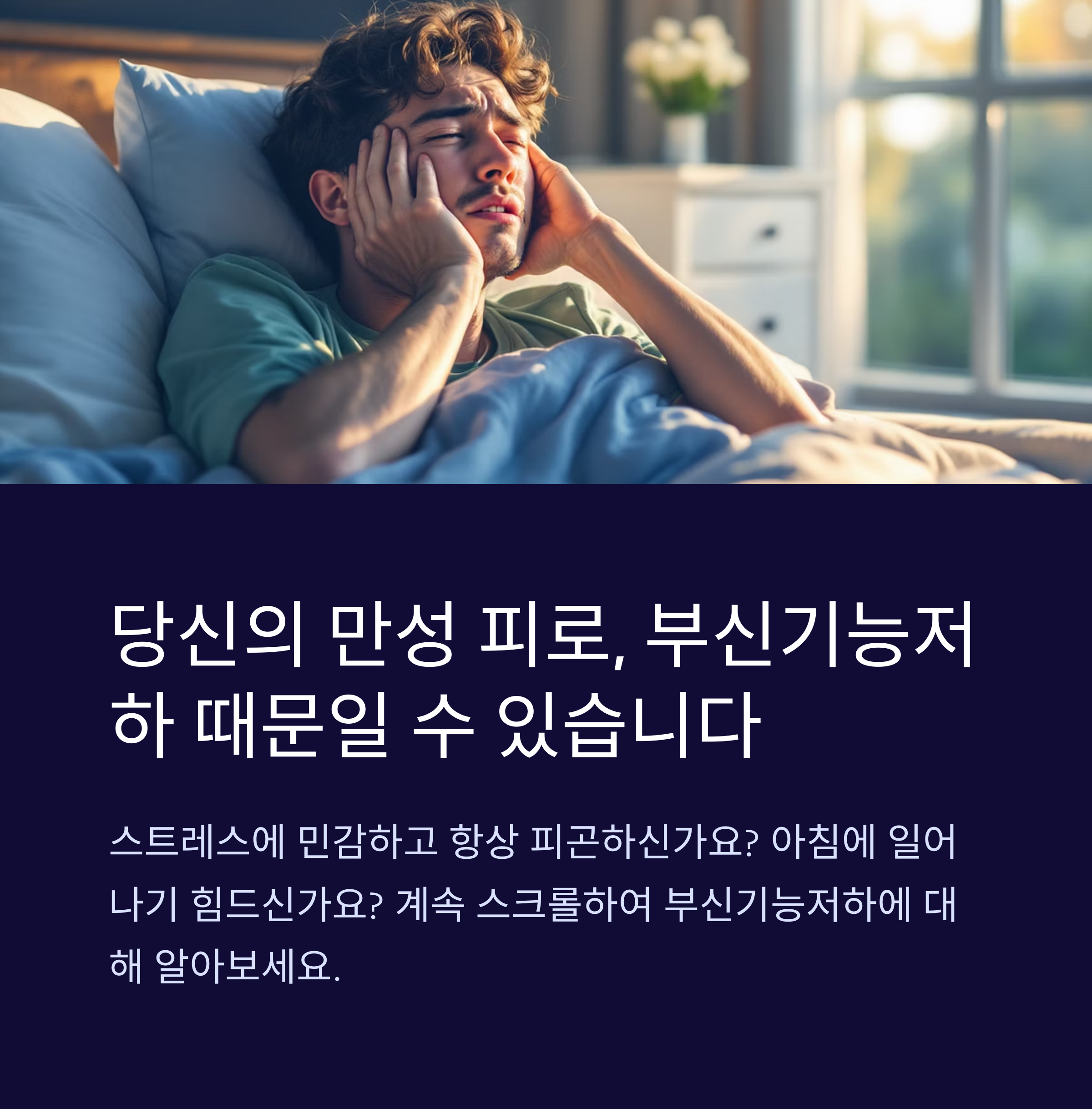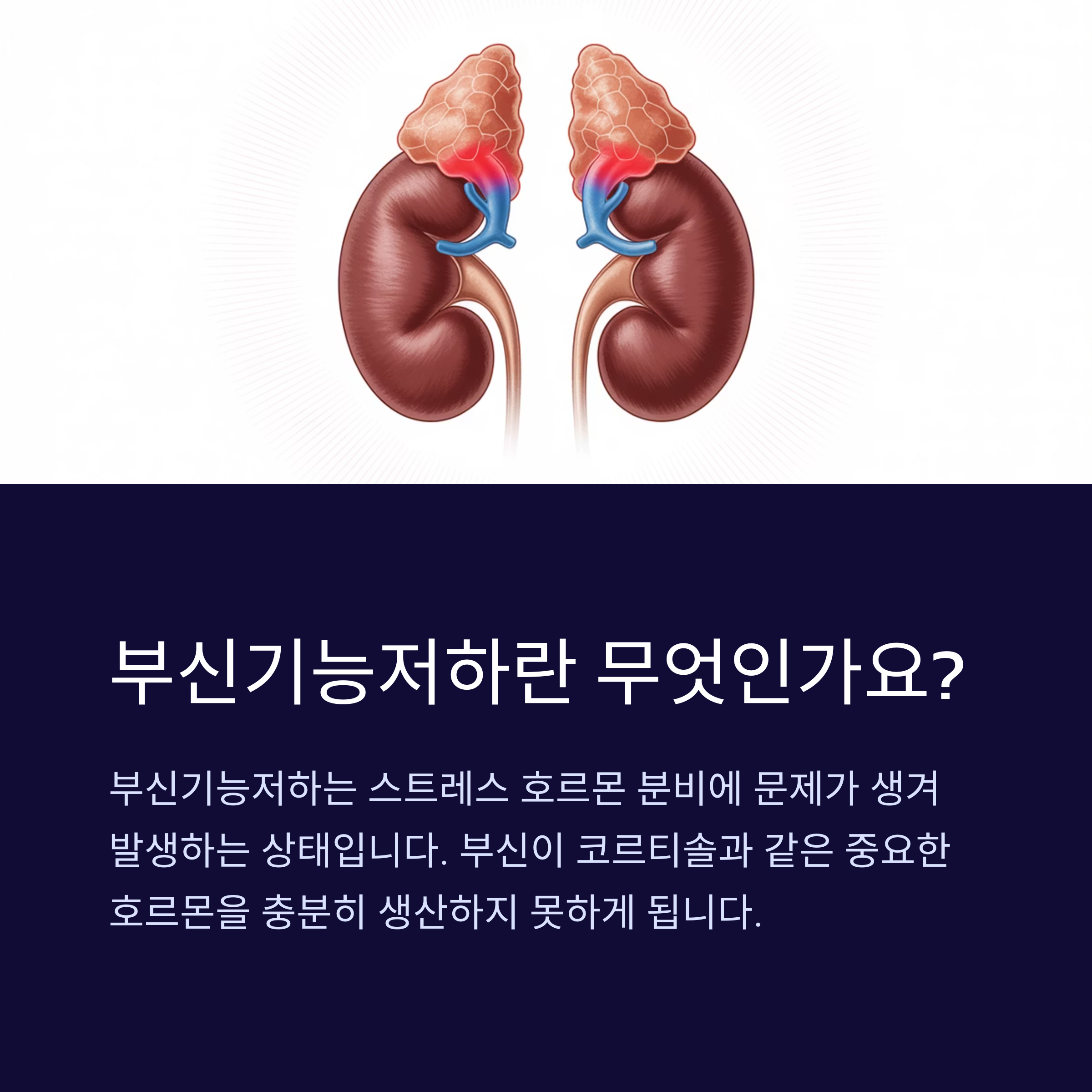 부신은 우리 몸에서 스트레스 호르몬을 분비하는 중요한 기관으로, 이 기능이 저하되면 다양한 신체적, 정신적 증상이 발생하게 됩니다.