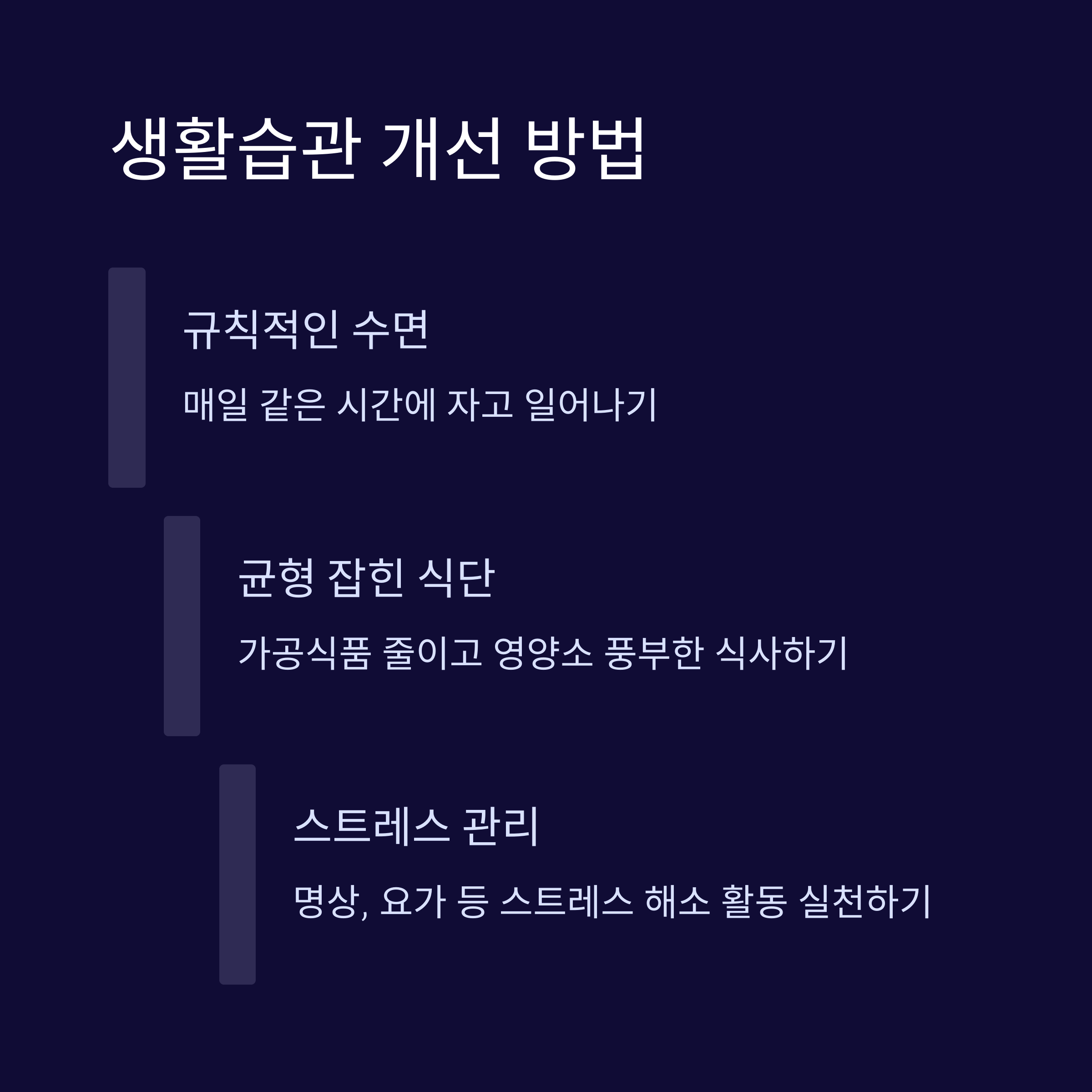 스트레스 관리, 충분한 수면, 규칙적인 식사와 운동은 부신의 회복을 돕는 핵심입니다.