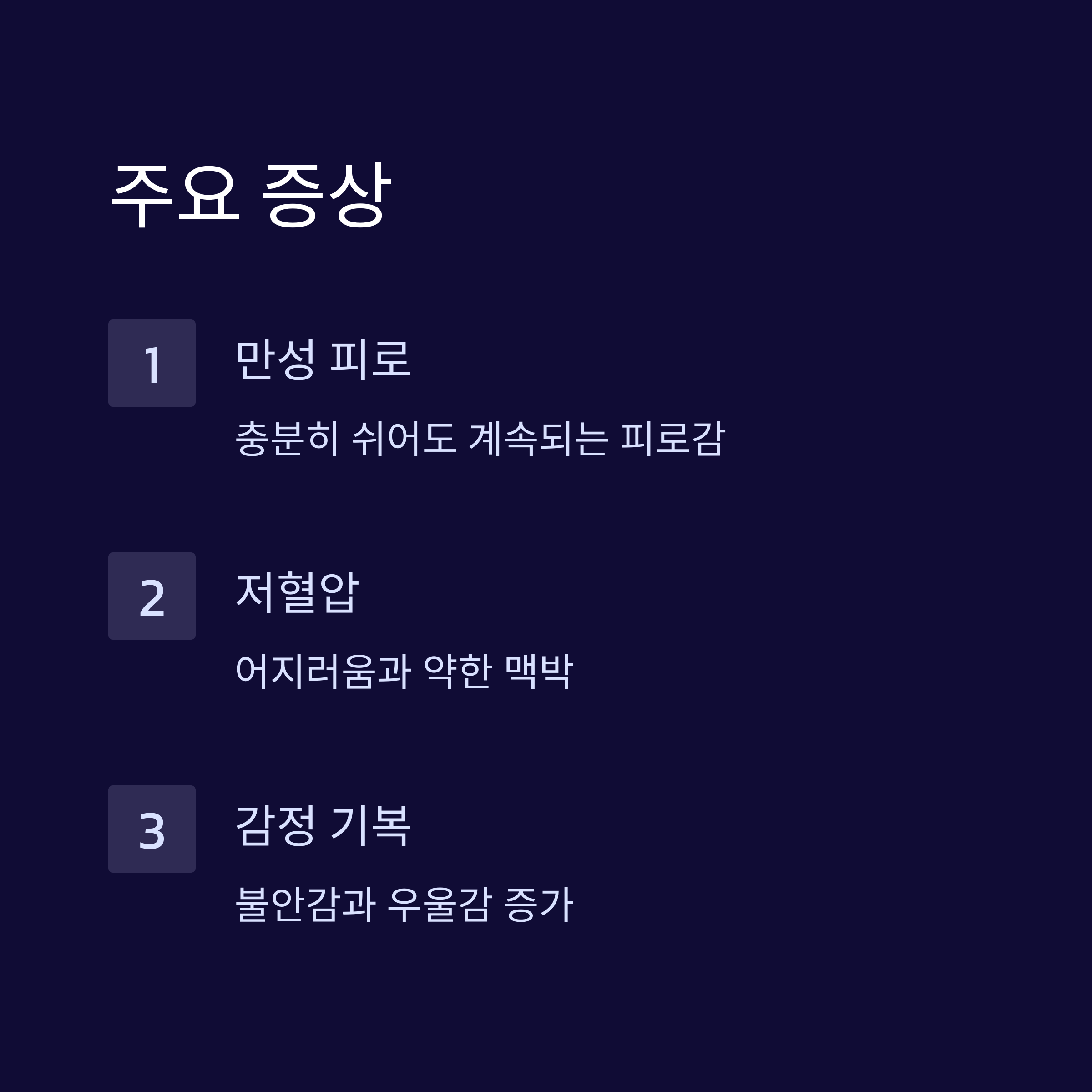 | 일상생활에 큰 영향을 미치는 피로 누적 현상입니다. | 계단을 오르거나 장시간 서 있을 때 어지럼증이 심해집니다. | 감정 기복이 심하고 일상 스트레스에 취약해집니다. |