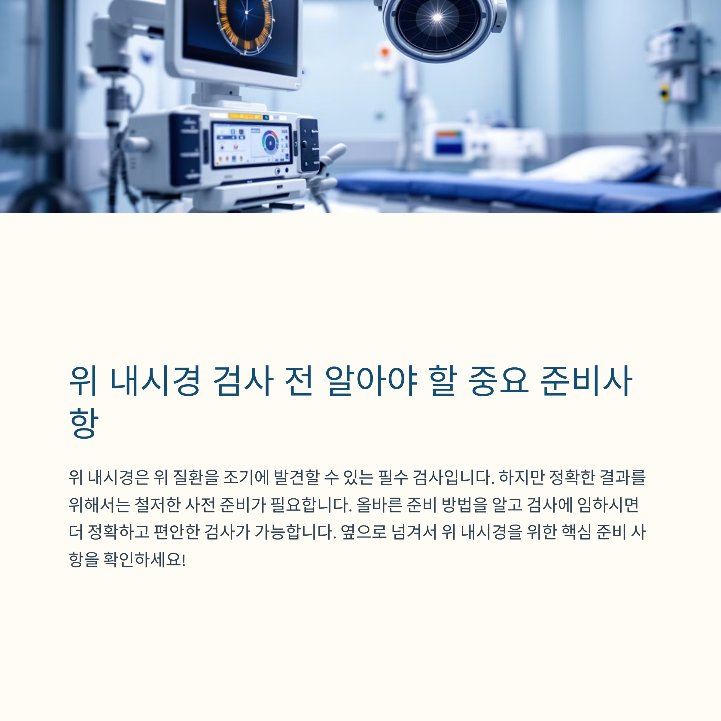 위 내시경 검사는 위와 식도, 십이지장을 직접 확인할 수 있는 중요한 검사입니다. 건강검진 시 필수적으로 권장되는 이 검사는 위암을 비롯한 소화기 질환을 조기에 발견하는 데 큰 역할을 합니다. 하지만 많은 분들이 검사 전 주의사항을 숙지하지 않아 정확한 결과를 얻지 못하거나, 불편함을 겪는 일이 발생하곤 합니다. 위 내시경 전에는 음식 섭취나 약 복용, 금기 사항 등에 대한 충분한 이해가 필요합니다. 이 글에서는 내시경 전 준비 과정에서 반드시 확인해야 할 실질적인 주의사항을 친절히 안내드리겠습니다. 본 내용을 끝까지 읽어보신다면, 내시경 전 준비가 훨씬 수월해지고 결과의 정확도 또한 높아질 것입니다. 병원을 방문하시기 전 꼭 확인하시길 바랍니다.