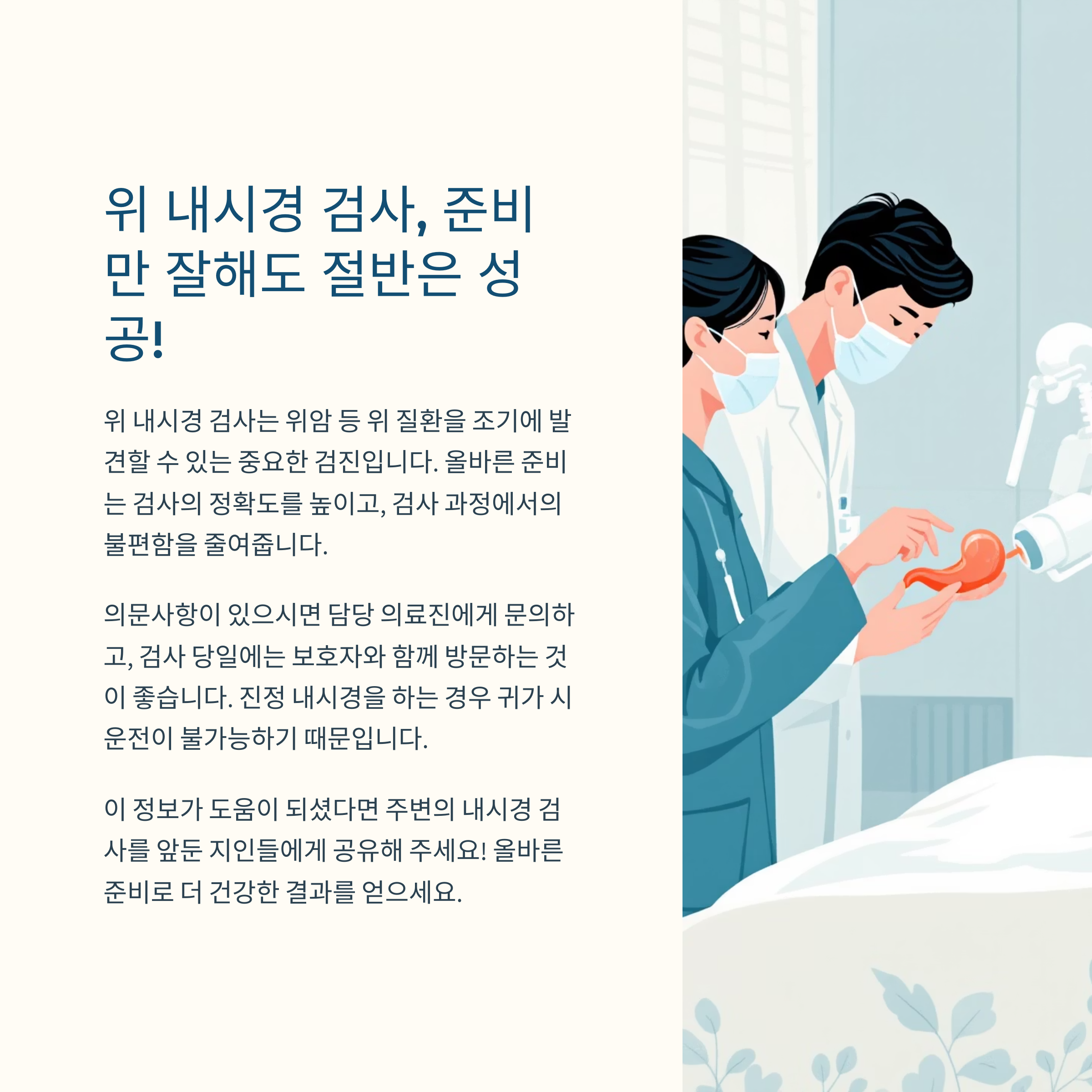 위 내시경은 위 건강을 점검하고 조기 질환을 진단하는 데 핵심적인 검사입니다. 그러나 준비가 미흡하면 검사 자체가 무의미해질 수 있기에, 검사 전 지켜야 할 사항을 꼼꼼히 숙지하는 것이 매우 중요합니다. 본 포스팅을 통해 금식, 약 복용, 검사 당일 행동 등 꼭 알아야 할 정보를 정리해드렸습니다. 의료진과 충분히 상담하고 안내를 잘 따라주신다면, 보다 정확하고 안전한 검사가 가능할 것입니다. 건강은 준비에서부터 시작됩니다. 이번 기회에 내시경 준비를 완벽하게 해보시길 바랍니다.